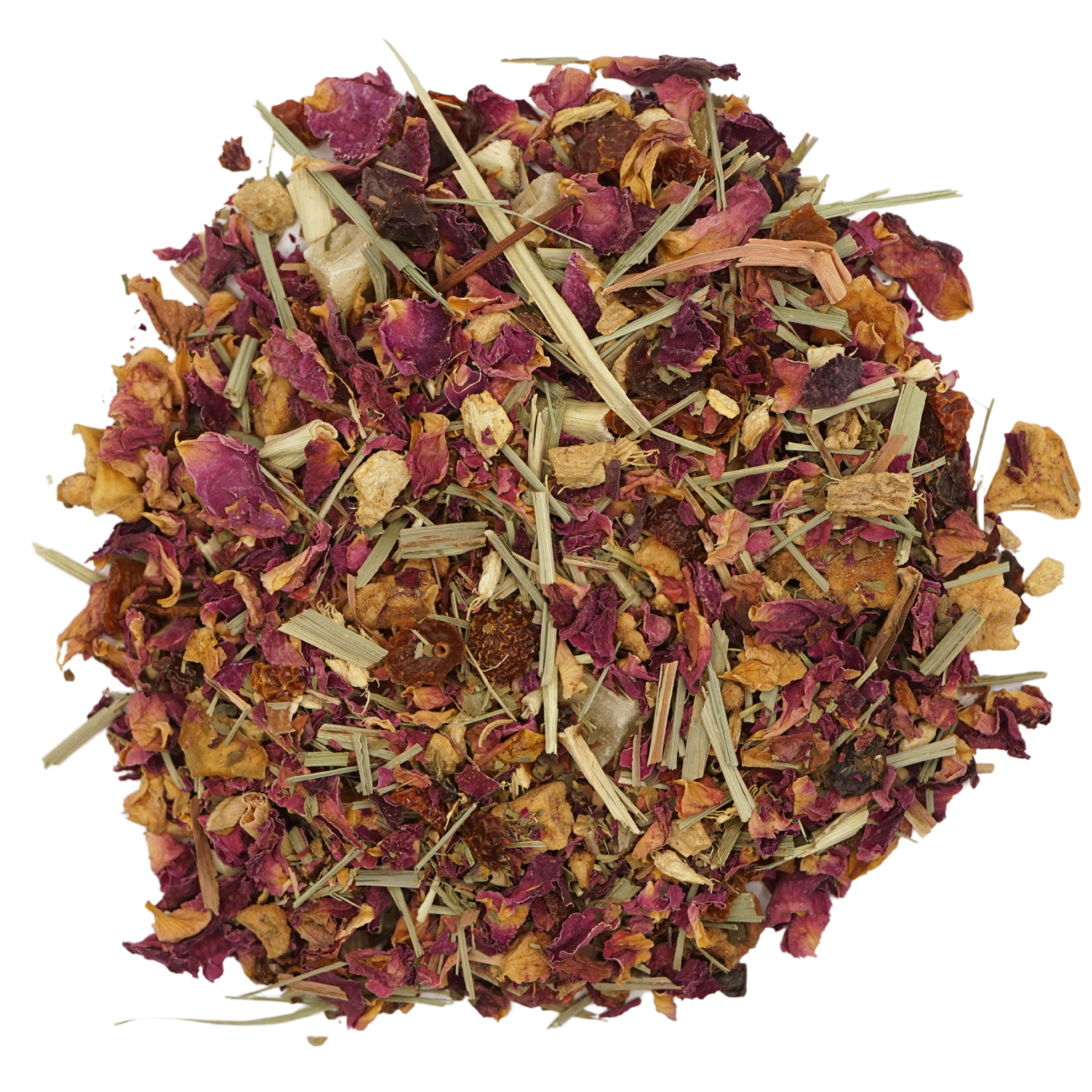 Tisana elaborada a base de rosas, jengibre y zacate limón.