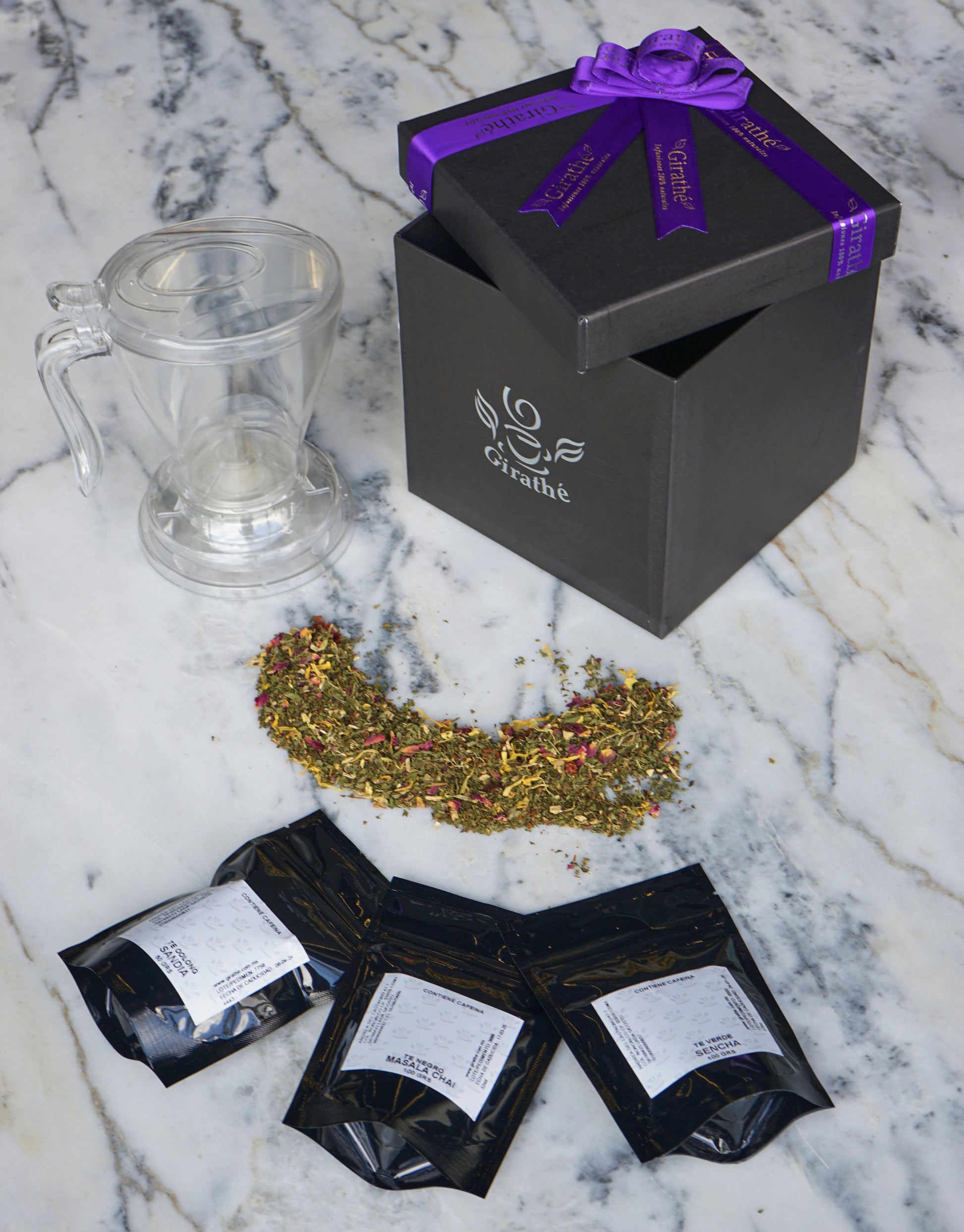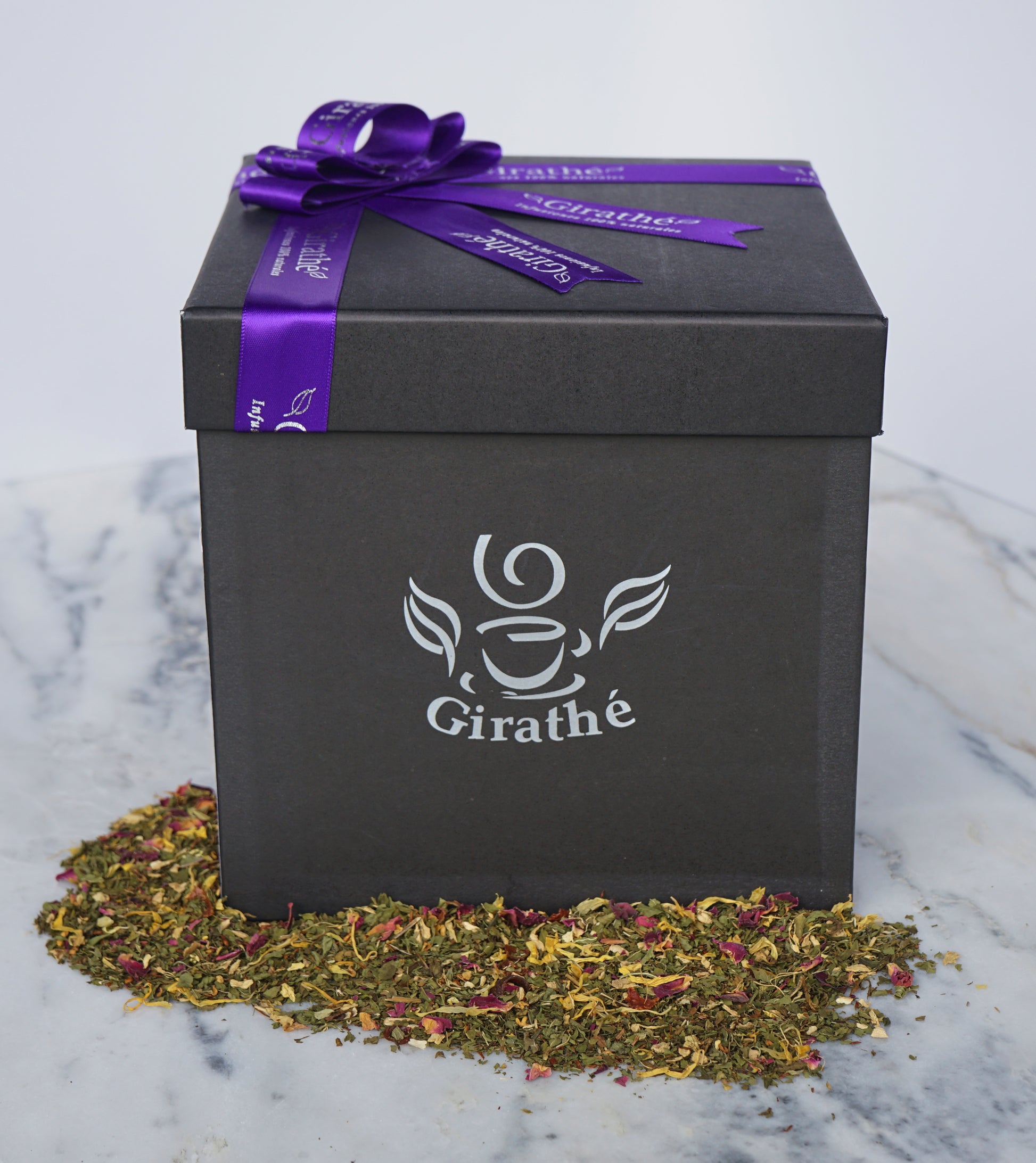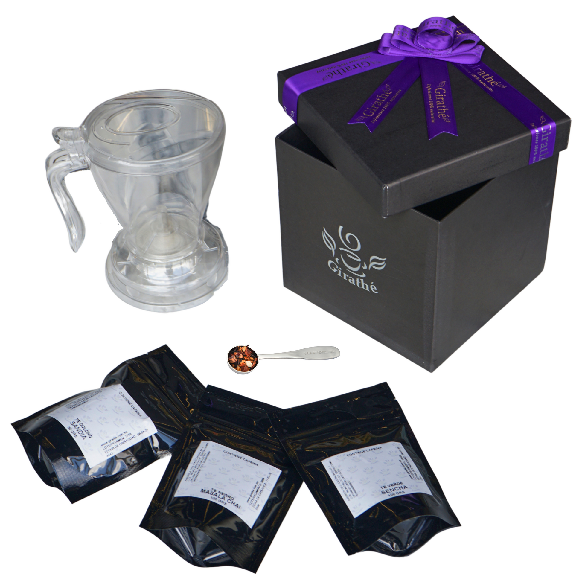 Disfruta la experiencia completa de Girathé con la caja de regalo que incluye una jarra acrílico, 3 bolsas de 50 gr de té (excepto matcha, gyokuro, lavanda, y perlas de dragon) y una cuchara medidora.
