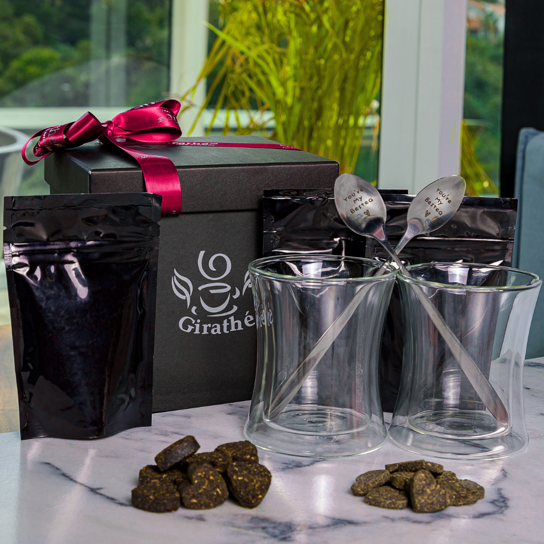 Kit de Regalo del Amor y Amistad (Té verde y te negro en forma de corazón de 100 gramos cada uno, Cuchara en forma de corazón, Vaso doble fondo, Caja para regalo)