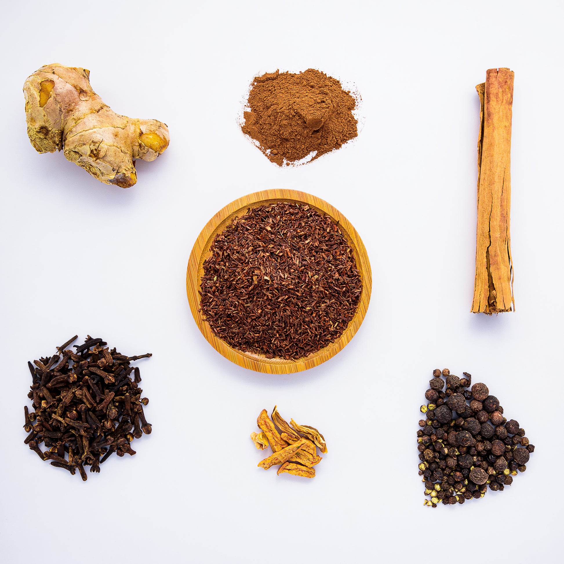 Rooibos: Conocido por su sabor naturalmente dulce y suave, el Rooibos es una base perfecta para quienes buscan una experiencia de chai sin cafeína. Su perfil de sabor terroso y ligeramente afrutado se entrelaza armoniosamente con las especias tradicionales del chai, creando una bebida reconfortante y cálida, perfecta para cualquier momento del día.