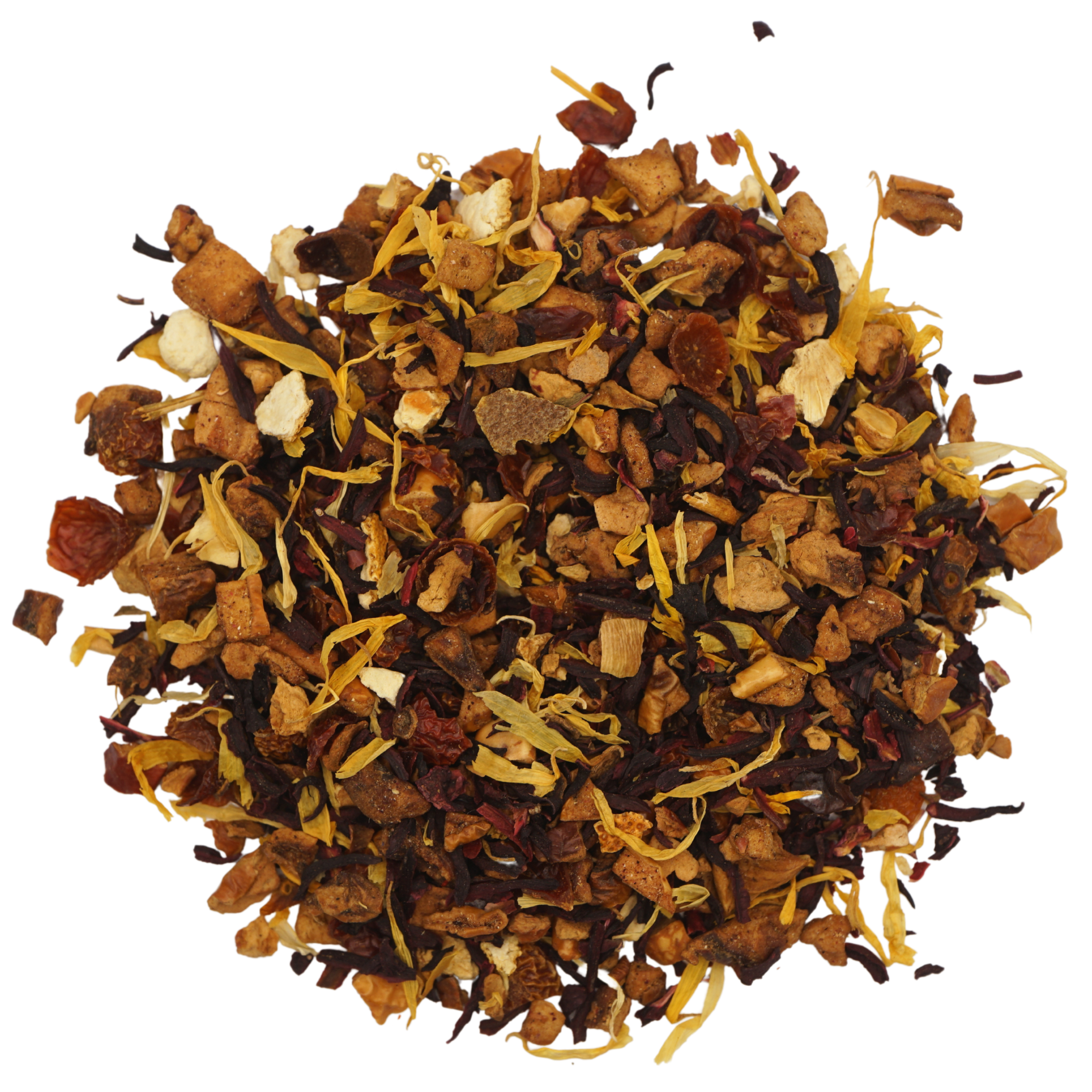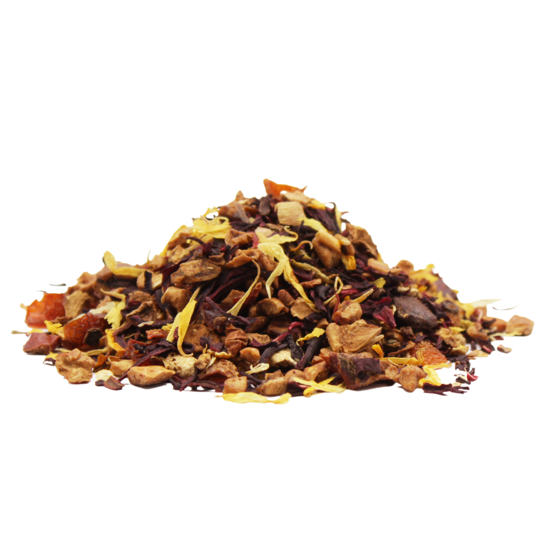 Tisana frutal de sabor dulce y suave, aunque no contiene azúcar, gusta mucho en frío. Con trocitos de manzana deshidratada, Jamaica, cascara de naranja y pétalos de flor amarillos.